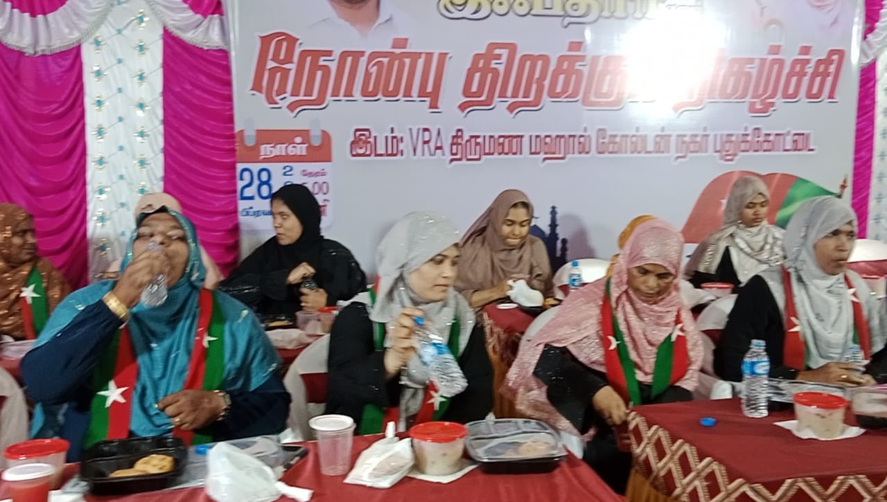 புதுக்கோட்டை கோல்டன் நகர் VRA திருமண மஹாலில் இன்று மாலை நடைபெற்ற நிகழ்வில் SDPI கட்சி மகளிர் அணி சார்பாக இஃப்தார் என்னும் நோன்பு திறக்கும் நிகழ்வு நடைபெற்றது 9வது நாளான இன்று நிகழ்வில் ஏராளமான இஸ்லாமிய பெண்கள் மற்றும் இந்து…